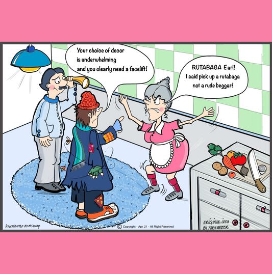 • Inside the cozy kitchen of an older couple we find a large kitchen knife, a mixture of carrots, onions and tomatoes lying on a cutting board ready to be used in a stew. An older gentleman stands off to the side holding an old fashioned trumpet style hearing aid up to his ear. A hobo with a scarf, winter hat, wearing torn, patched, dirty ratty clothes has his arm extended with his index finger pointing directly at a lady making dinner. Christmas, birthday, celebrations greeting cards and Gift bags