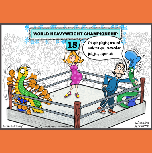 • In a crowded boxing venue a ring girl standing in the center of the boxing ring is holding up a sign indicating a boxing batch is heading into the 15th round. Between rounds, sitting on a stool in the left hand corner of the ring is a centipeed wearing an endless amount of boxing gloves on both sides of his body, from head to toe. In the right hand corner there is a worm sitting on a stool with a lone boxing glove stuck on his head. The worm is clearly battered, bruised and exhausted. Anniversary.